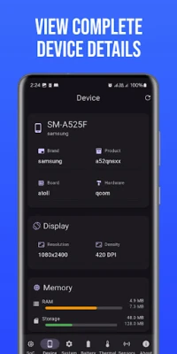 - Memory & Storage – Check RAM usage, available memory, and storage details.