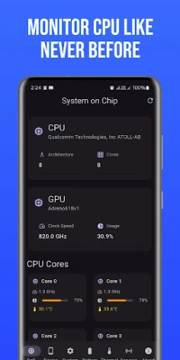 - CPU Monitor – View real-time CPU usage, frequency, cores activity, and temperature.